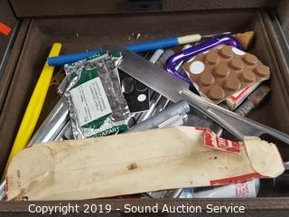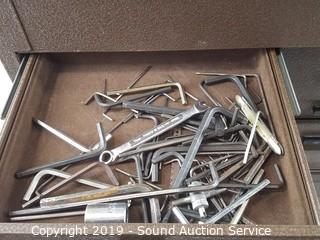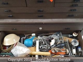 Item Description: Top piece is locked shut, can still access the drawers. Comes with Allen wrenches, scissors, bits, clamps, chain, JB weld and more. 21" T x 28" W x 10" D.