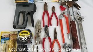 Item Description: Padlocks, hanging hooks, Stanley stapler with staples, tape measures, hack saw, pry bar, and more.