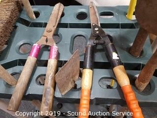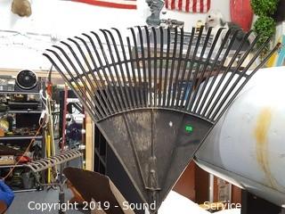 Item Description: Leaf rake, brush rake, Loppers, edger, square shovel and cultivator. Rack is 37.5" x 18" x 35".