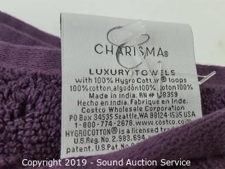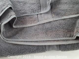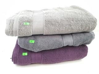 Item Description: Includes Charisma purple towel (has some fraying on the edge), Turkish grey cotton towel (has some discoloring) and Mira Bella sage green bath towel.