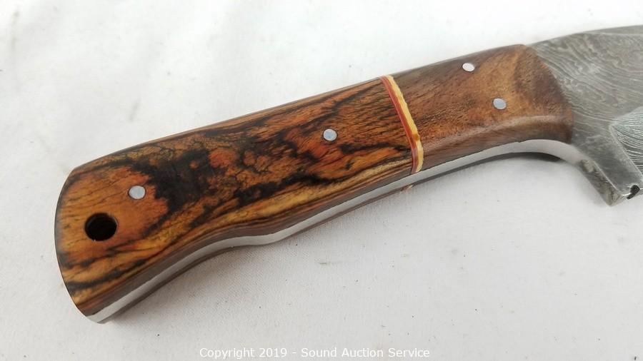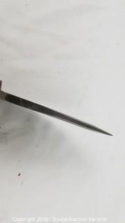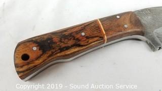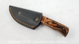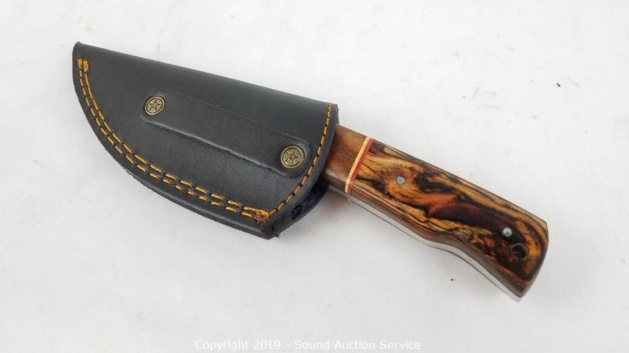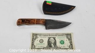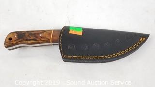 Item Description: Comes with leather sheath, has wood handle, fixed blade. Approx 8.5" long, 4" long blade.