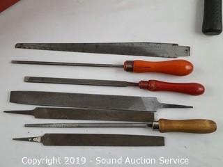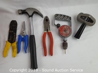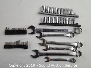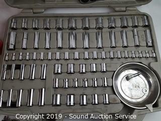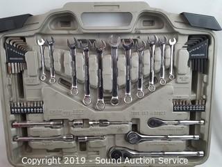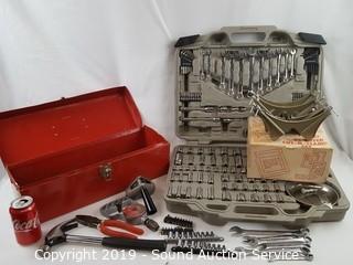Item Description: Tool set is mostly complete, missing one open wrench and bit driver. Craftsman 45" miter cut & clamp set, steel red tool box with various tools (sockets, wrenches, hand drill,