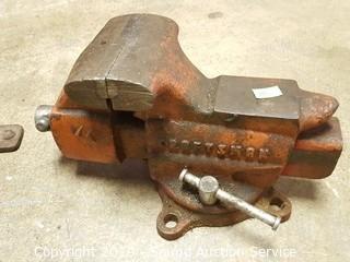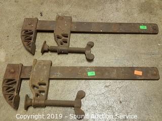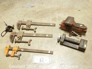 Item Description: Includes Craftsman 3.5" jaw vise, 2 old Hargrave 12" bar clamps, 12" Jorgenson bar clamp and 4.5" jaw machinist vise.