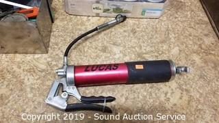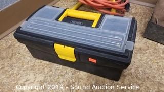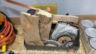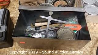 Item Description: Includes steel box with coping saw, micrometer, and more, grinding and circular saw blades, leather gloves, wired brush, grease gun, 12 half pint jars with lids,