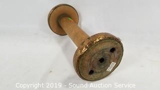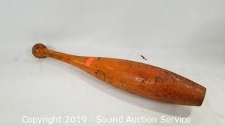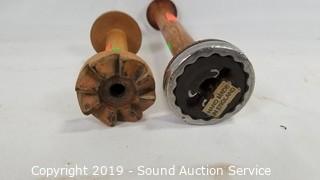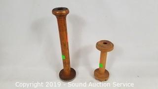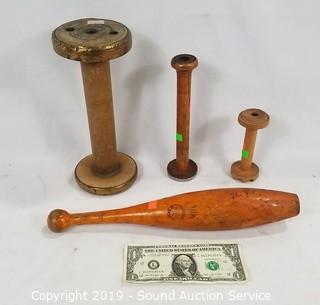 Item Description: Jugging club is 3/4 lbs, model O, made in Columbia, 13.5" long. Textile spools are 8" and 9.5" tall, 2" and 4" diameter.