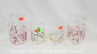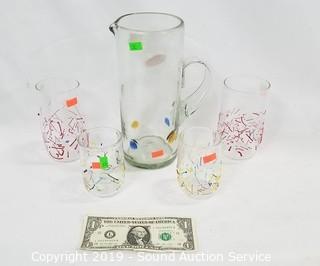 Lot #0232: Signed Art Glass Confetti Cups & Pitcher