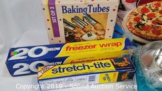Item Description: Includes pasta maker, checkerboard cake pan set, baking tubes, pizza baking stone set, stretch wrap and freezer wrap.