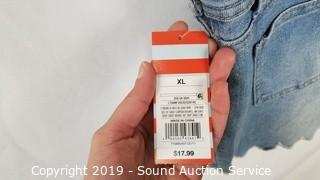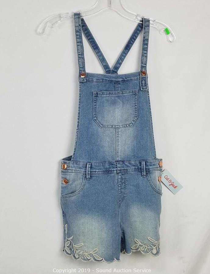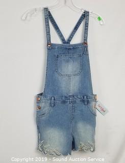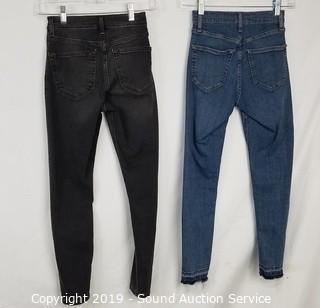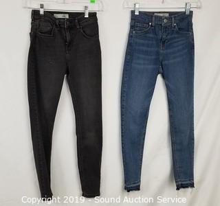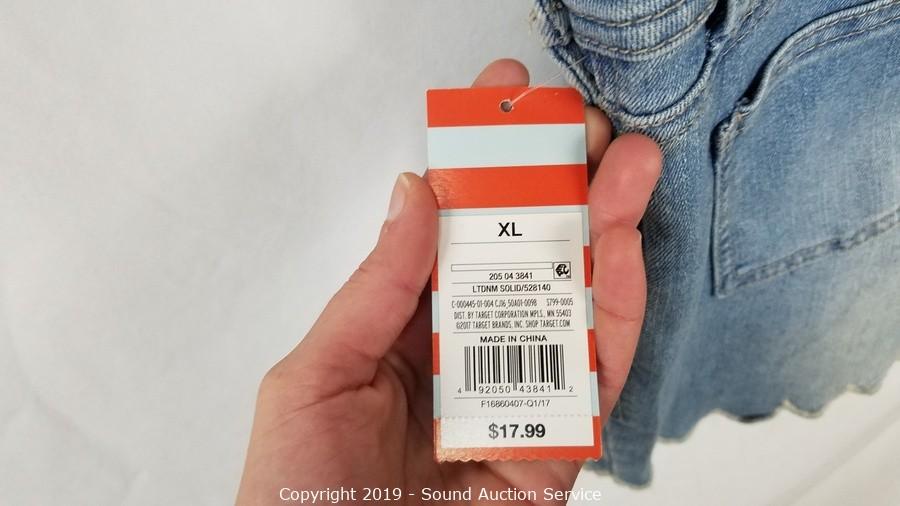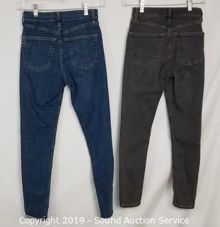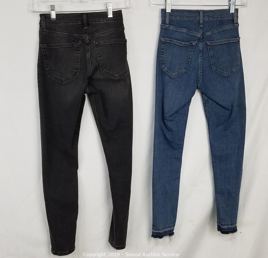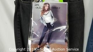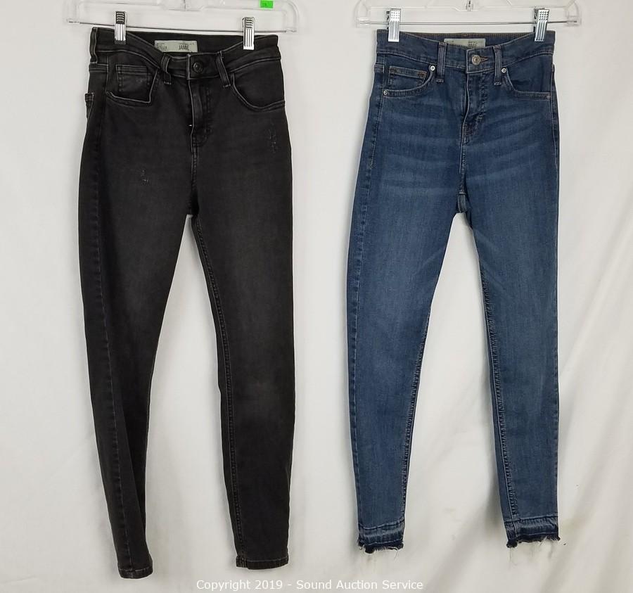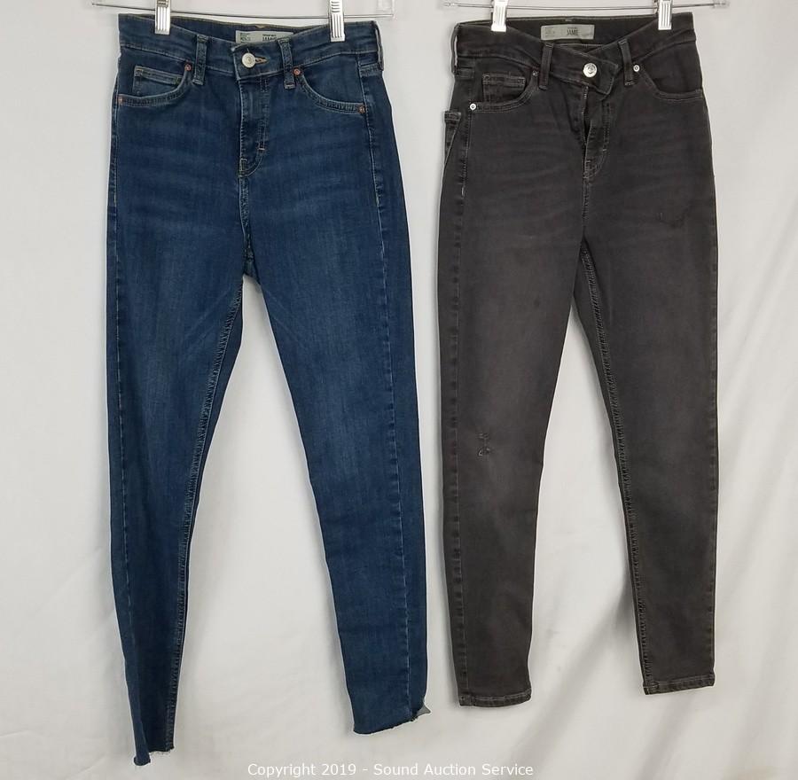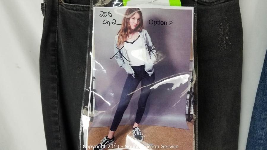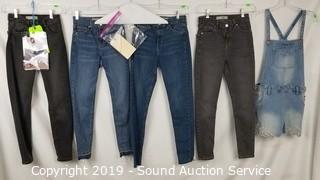 Item Description: 4 Top Shop "Jaine" 25/28 (2 blue, 2 grey, comes with scene information and wardrobe photo), Cat & Jack denim overall skirt sz. lg. All items come from the set of Get Shorty