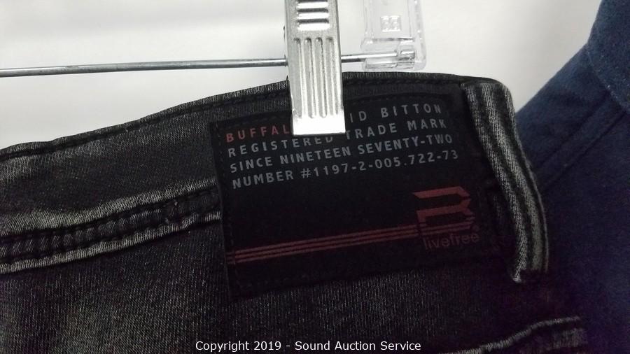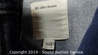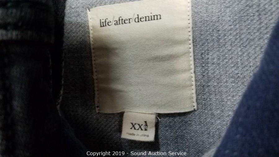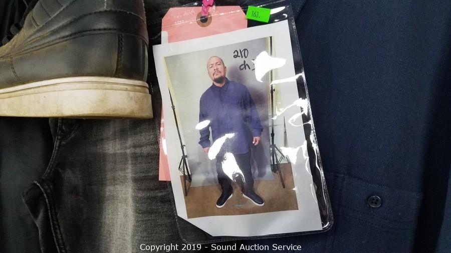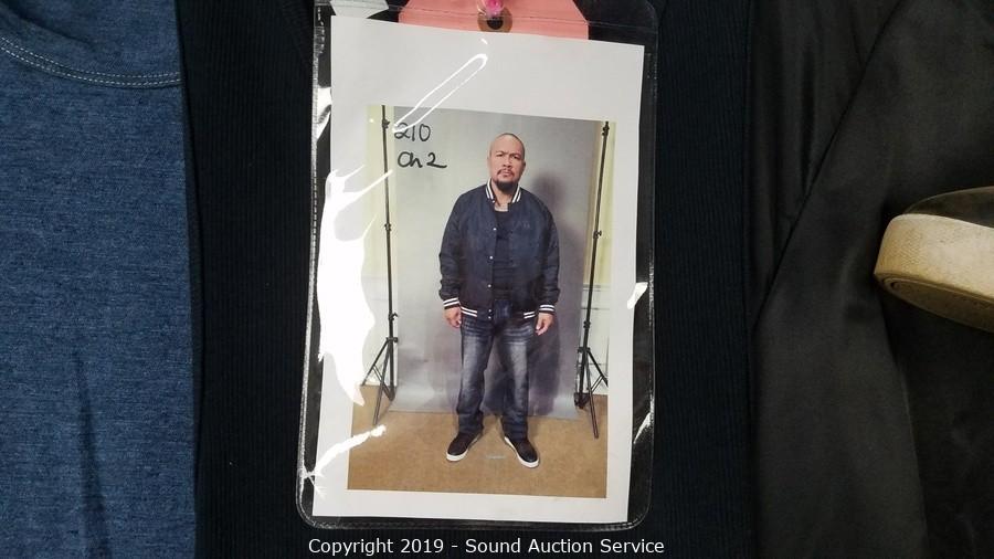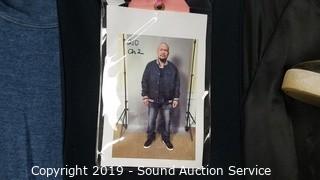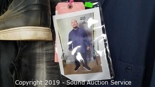 Description Cont. 1: grey denim jeans 36x34, Levi's black/brown leather belt 35-41, Champion blue heather t-shirt sz. lg, Life After Denim cotton button up jacket sz. XXL, . All items come from the set of Get Shorty at the conclusion