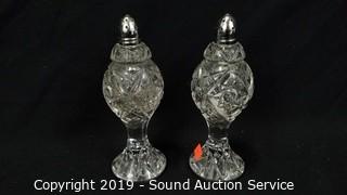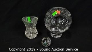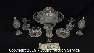 Item Description: Includes prism paperweight, 2 cruets, 2 candy dishes, bud vase, fairy light candle votive, salt and pepper shaker, 8" console bowl and 12" footed bowl.