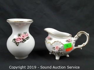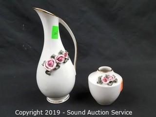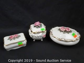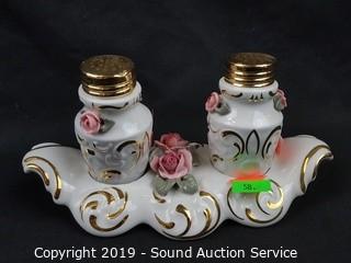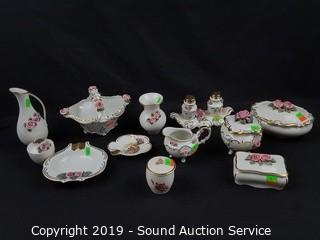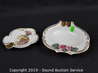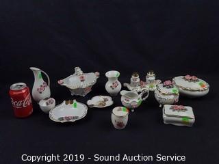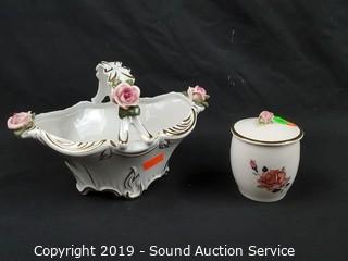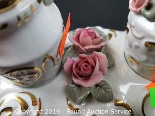 Item Description: Elegant fine porcelain roses with gold accents, ashtray, covered dishes, salt & pepper with tray, handled basket, bud vases. Salt and pepper tray has chipped rose bud.