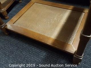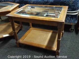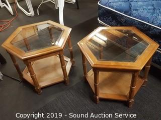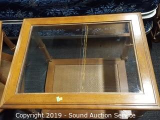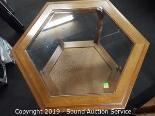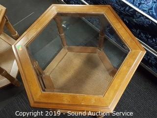 Item Description: 2 tier, beveled glass top, wicker wove bottom. 2 are hexagon 21" x 24" diameter and 1 rectangular 21" x 27" x 21". Some wear to the finish.