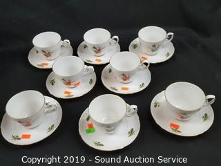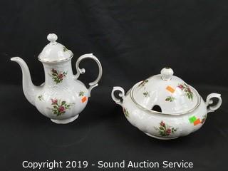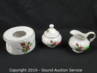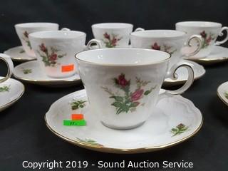 Item Description: Rose print with gold accents. In excellent condition, some minor wear to the gold rim. Includes 8 cups, 8 saucers (one has a chip), tea pot, tea warmer, cream, sugar, 12 snack