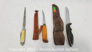 Item Description: Aluminum handle fixed blade knife w/leather sheathe. Fillet knife with leather sheathe. LK. Co. Letter opener with folding knife. Brass spike with leather sheathe, Gerber