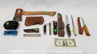 Lot #0280: 8 Various Knives, Hatchet, Multi-Tools & More