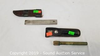 Description Cont. 1: honing steel. Camillus folding utility knife. husky multi-tool. And hatchet with leather sheathe.