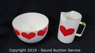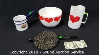 Item Description: Heart bowl and pitcher are Rabia. Pot is Federal Baby Dear. Pancake maker is only one half, patented 1922.