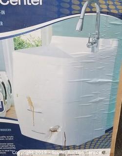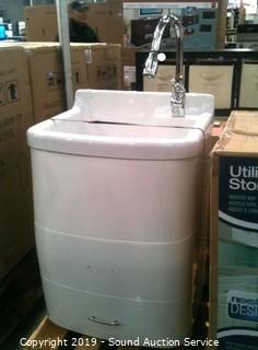 Item Description: Modern MDF cabinet with built in acrylic sink, chrome pullout faucet & large storage drawer. Looks to be brand new and complete, the box has had a pest get into it but don't