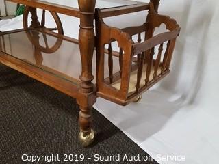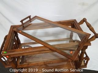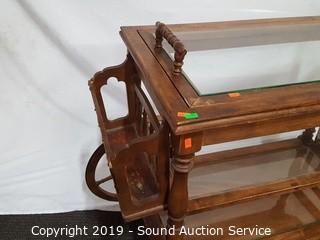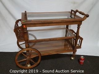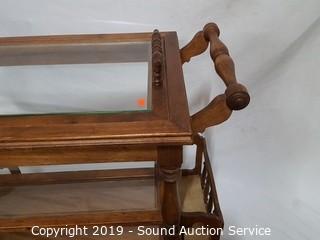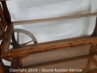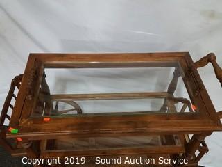 Item Description: Solid wood construction with glass top on second and top tier. Top has removable tray. 28" x 39" x 19".
