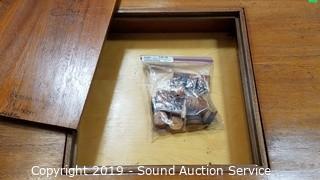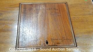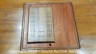 Item Description: 2 Drawers, flip top and storage with cribbage board. Has some writing on the top. 30" H x 33" x 21" to 36".