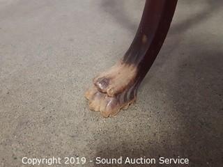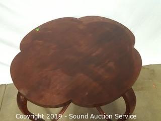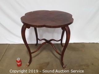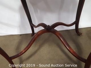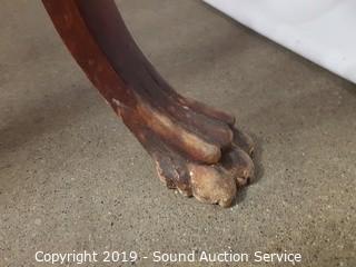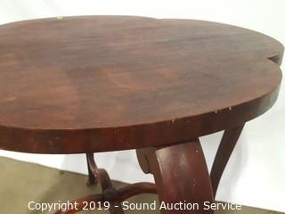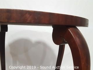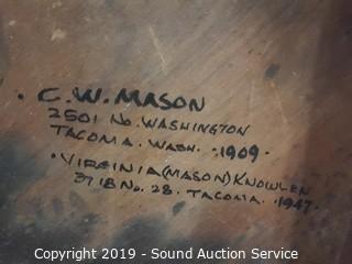 Item Description: It has name, date and address of people who have owned it. Originally purchased in 1909 by a C.W. Mason, purchased again in 1947 by Virginia Knowlan. Some wear to the finish. 28" x 30" dia.