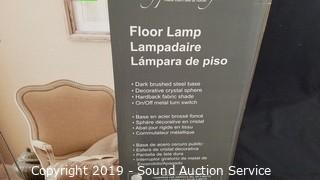 Item Description: Brushed steel base, decorative crystal sphere, hard back fabric shade. Complete, works, like new.