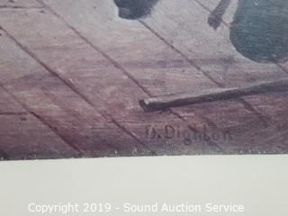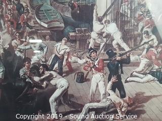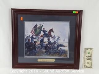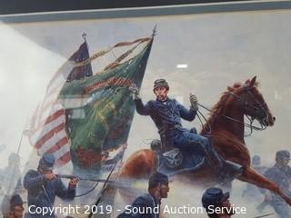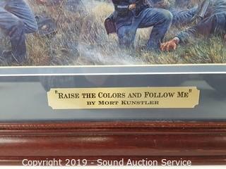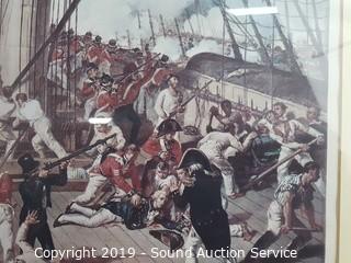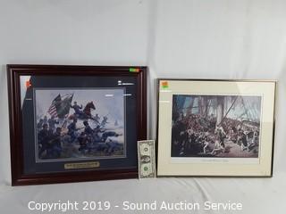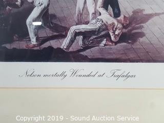 Item Description: Kunstler is a Civil War print, professionally framed, matted with a brass title plaque titled "Raise the Colors and Follow Me" 19" x 17". Other is titled "Nelson Mortally Wounded at Trafalgar" by Denis Dighton, framed, matted with glass, 18.5" x 15".