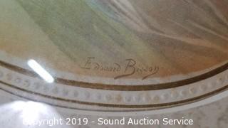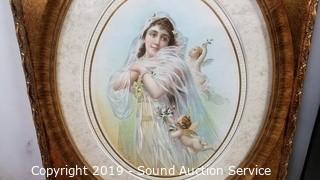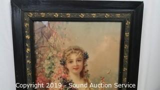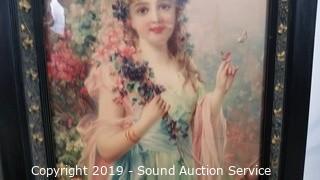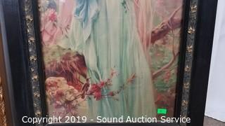 Item Description: Beautiful lady in the forest with an vintage black frame with glass, 16.5" x 29.5". Other is a beautiful women with cherubs litho by Edouard Bisson, gold framed, matted with glass, 13" x 16".
