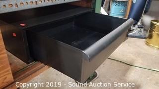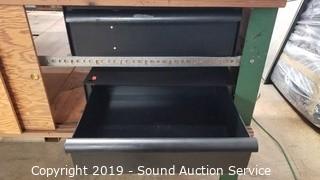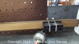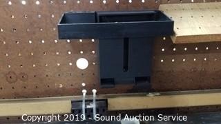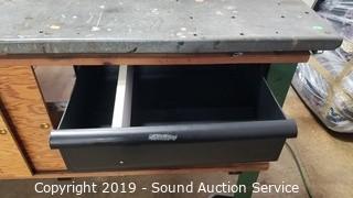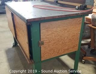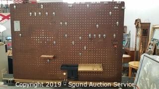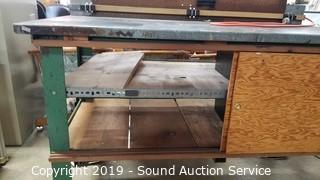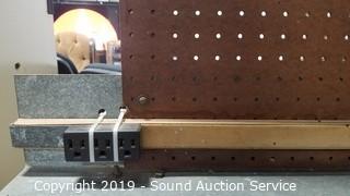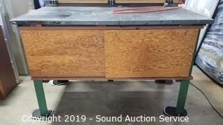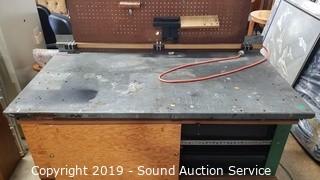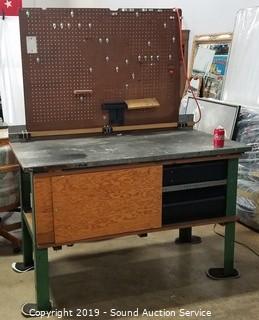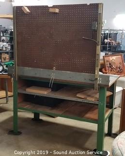 Item Description: Solid steel base, peg board back. with some hooks, mounted power strip. 37" to table top, 58" W x 30" D. 73" tall overall.