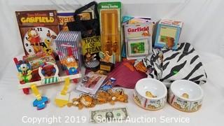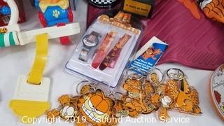 Item Description: Twin sheet set, pet place mat, food bowls, wristwatch, wallet, window/mirror decorations, story book, child's stroller mount toys, candles, figures, jigsaw puzzle, 1994 calendar, watch and figure set, and more.