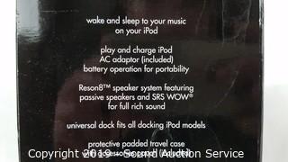 Item Description: Works. Comes with power supply, transfer cable for MP3 and CD, travel case, and extra iPod stand.
