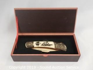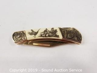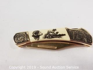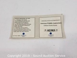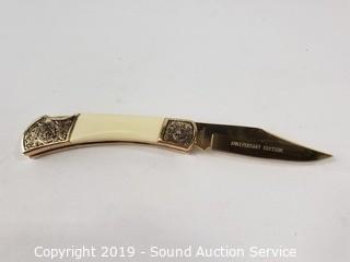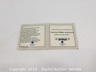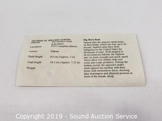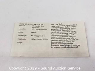 Item Description: Bald Eagle & Big Horn Ram. 420 stainless steel gold plated. Limited to 9,999. 3" blade, 7.25" long overall. Comes with original collectors boxes & COA with