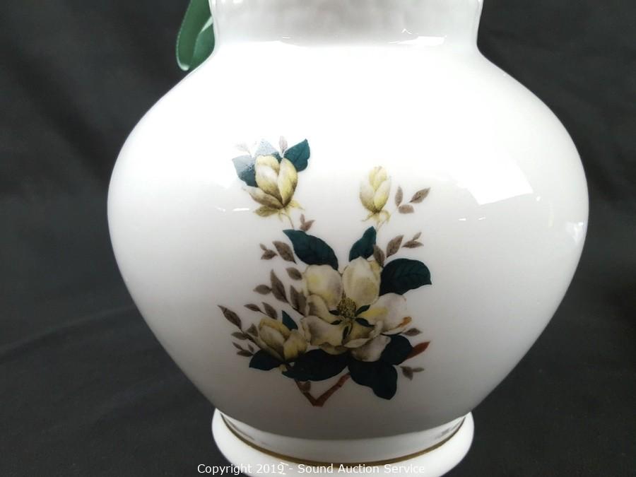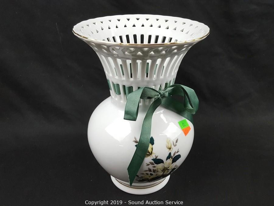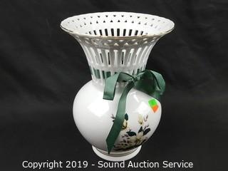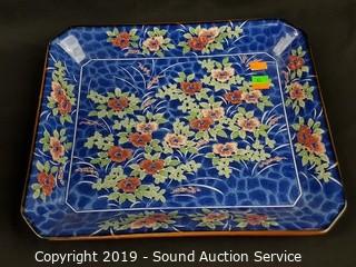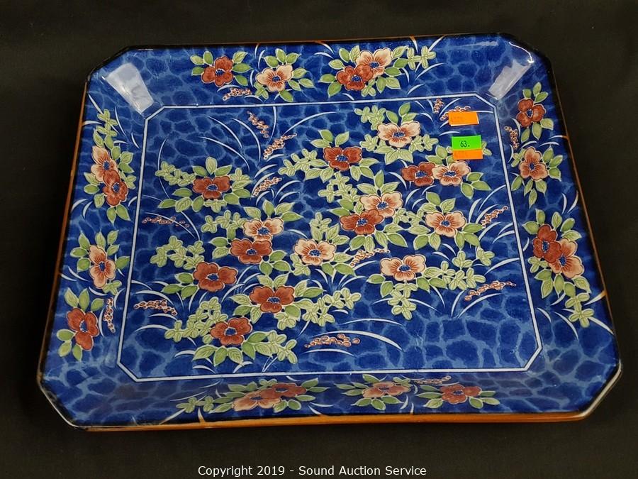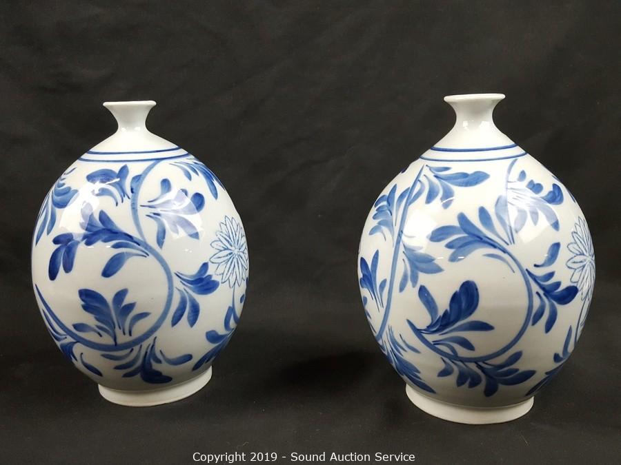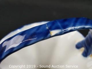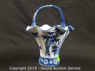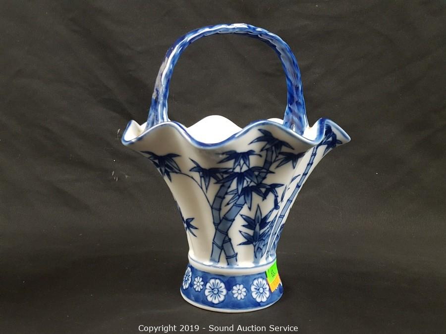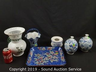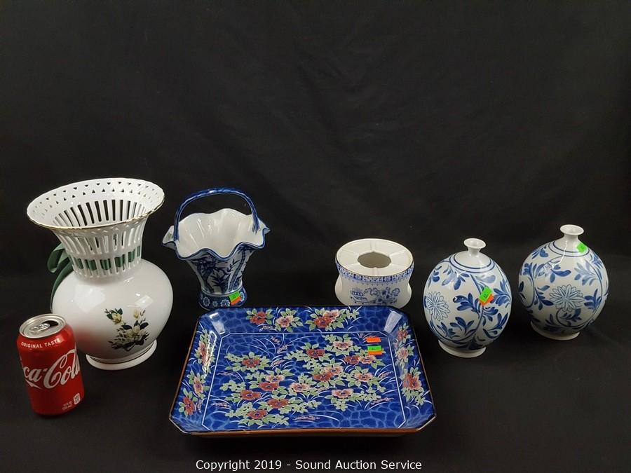 Item Description: Includes blue floral tray, Formalities floral print filigree vase, 2 blue Asian stem vases, Formalities blue bamboo handled basket (handle has been repaired) and Feltmann