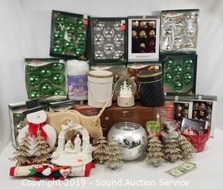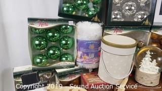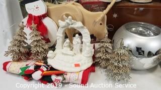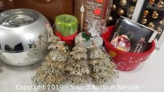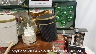 Item Description: Candles, candle lamps, ornaments, lighted porcelain house, porcelain bisque nativity scene, water globe, wood moose candy dispenser, and more.