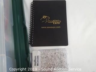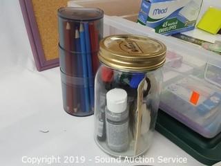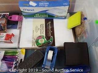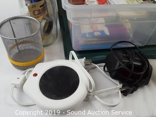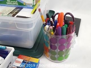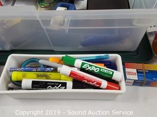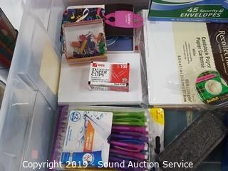 Item Description: Pens, pencils, post it notes, alarm clock, tacks, stapler, organizer, tape, and more. Tote with lid included, 6" x 16" x 22".