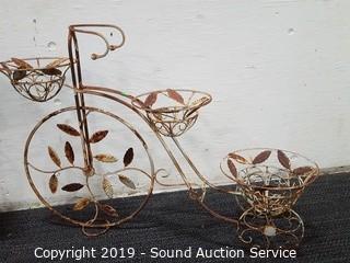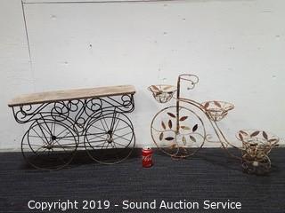 Item Description: Planter is in the shape of an old bicycle, 22" x 31", 8" and 9" planters. Bench is approx. 19" x 29.5" x 7".