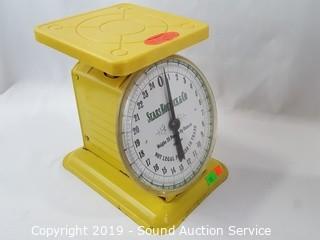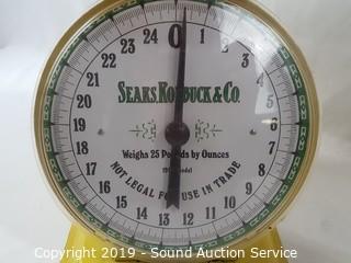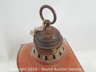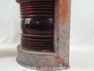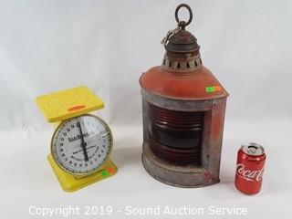 Item Description: Marine lamp has ruby red glass, some wear to the paint. 16" x 7.5" x 7.5". Scale is Sears Roebuck, 25lbs, some wear to the paint.