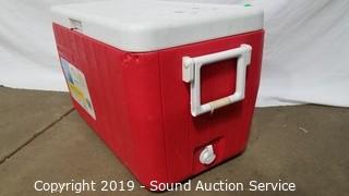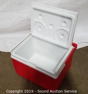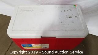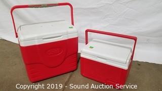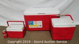 Item Description: 2 lunch pail coolers and full size cooler. 7" H x 10" x 7", 11" H x 11" x 9" & 48qt, 15" H x 24" x 13".
