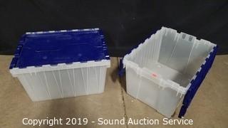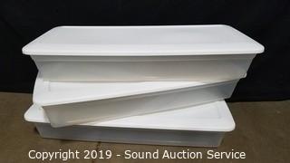 Item Description: 3 low profile totes, 5.5" H x 15" x 33". 2 flip top totes, 12" H x 15" x 21". And organizer, 25" H x 21" W x 14" D.