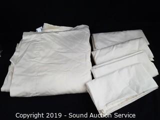 Item Description: With wrinkleshield. 1 flat and 4 pillow cases (2 have some dirty spots). Ivory color.