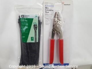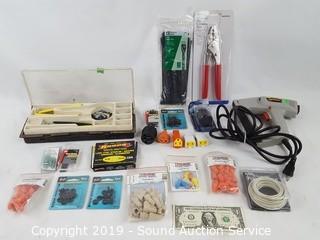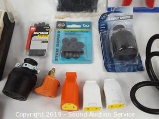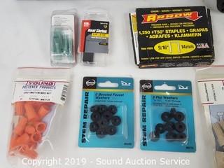 Item Description: Replacement power cord inlets, beveled faucet washers, heat shrink tubes, electrical twist on wire nuts, wire hex crimping tool, staples and Stanley electric staple gun.
