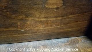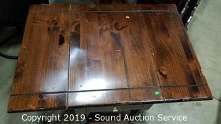 Item Description: Dark stained pine. Some wear to the finish. 24" H x 17" - 37" W x 27" D.