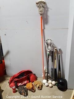 Item Description: Bats, lacrosse sticks, helmet, baseballs, mitts.