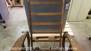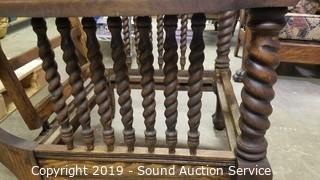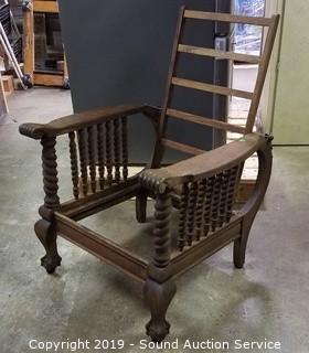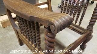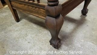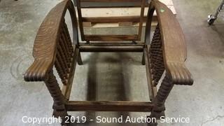 Item Description: Cast iron hardware, ball and claw foot, turned wood supports, quarter sawn oak finish. No cushions or bottom support. 41" x 31" x 31".