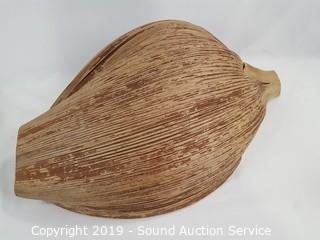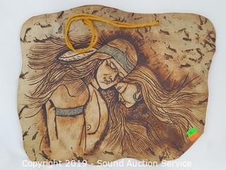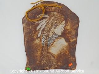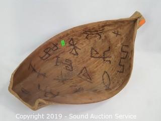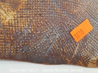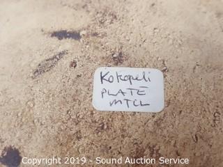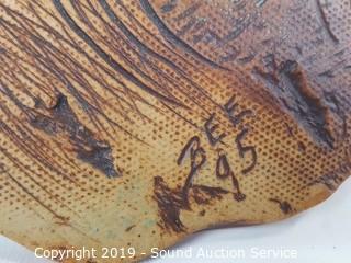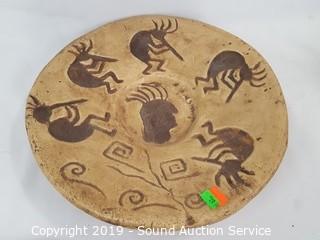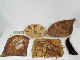 Item Description: Rune carved husk (19" x 11"), Kokopelli pottery dish plate, 2 signed Native pottery tiles signed Bee 1995 (12" x 15") and horse hair keychain.