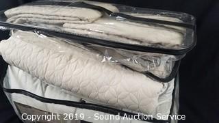 Item Description: Comforter, 2 shams, coverlet (has a couple dirty spots) and 2 quilted shams. Lightly used.