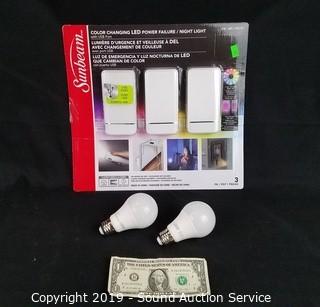 Lot #0325: Color Changing LED Night Lights & 2 Smart Bulbs