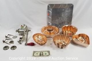 Lot #0241: Vtg Countertop Grinder, Cake Molds & Aluminum Tray
