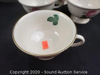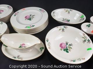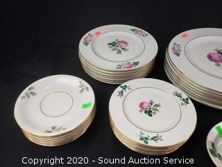 Item Description: Includes 7 dinner plates, 7 salad plates, 7 snack plates, 7 saucers (one has a chip), 5 tea cups, gravy boat, 9" serving bowl and 10" oval serving bowl.