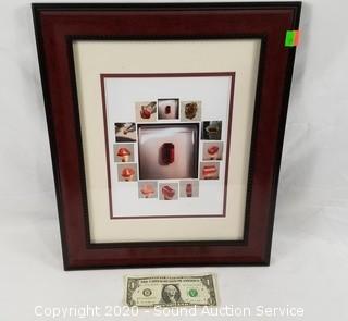Description Cont. 2: Dia. Ceiling Light, Slatted Back Accent Chair, Framed Ruby Gemstone Cutting Collage.